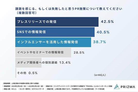 実際に、調査PRサービス「PRIZMA|調査リリース」にて、広報担当者・マーケ担当者501人にアンケート調査を実施したところ、約8割が現在実施しているPR施策に課題を感じる、もしくは失敗したと回答しています。