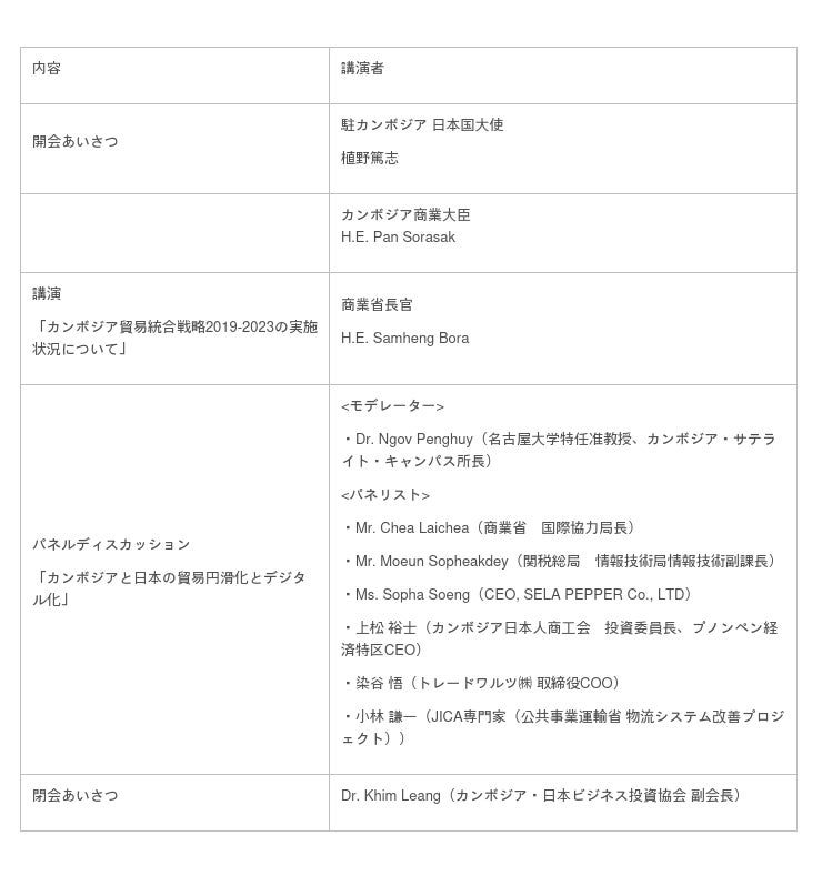 トレードワルツは3月タイ開催のイベントシリーズに登壇しておりましたが、今回は6月カンボジア開催のものに登壇した形となります。主催はカンボジア・日本ビジネス投資協会(CJBI)が務め、「貿易の円滑化・デジタル化」をテーマに日・カンボジアの政府・民間専門家が講演・パネルディスカッションを実施しました。
