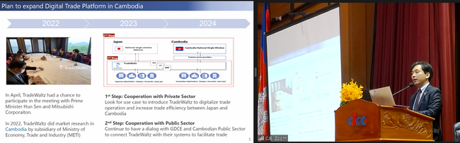 トレードワルツはパネルディスカッションで、1.貿易業界が持つ課題や、1つの解決策TradeWaltzの紹介、2.ASEAN各国 貿易プラットフォームとの連携実証(https://www.tradewaltz.com/news/3315/)、3.カンボジア展開に向けたフン・セン首相との面談(https://www.tradewaltz.com/news/2046/)、関税総局長との対話(https://www.tradewaltz.com/news/3625/)、政府とのカンボジア市場調査の状況(https://www.tradewaltz.com/news/5127/)などについて報告を行い、今回4.カンボジアを含むASEAN10カ国と日本が今後50年間デジタル貿易情報でつながる未来を提案しました。