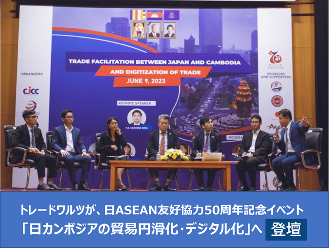 貿易情報連携プラットフォーム「TradeWaltz(R)︎」を運営する株式会社トレードワルツ(以下:トレードワルツ)は、2023年6月9日に、カンボジア・プノンペンで開催された日ASEAN友好協力50周年記念イベント「日カンボジアの貿易円滑化・デジタル化」に登壇致しましたので、ご報告いたします。