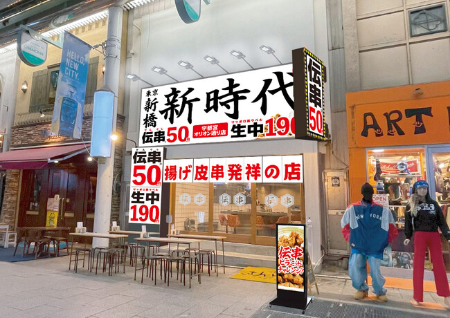 「新時代」は、『伝串』という商品が名物で、累計販売本数1億本を超えます。揚げ皮串発祥のお店です。