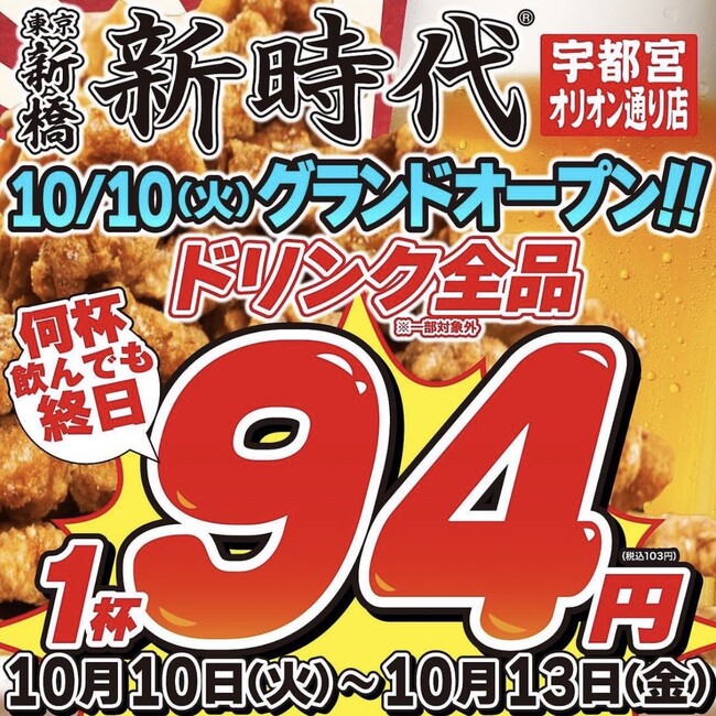 10月10日(火)~10月10日(金)までドリンク全品が何杯飲んでも1杯94円!