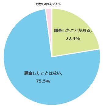 次に、子どもがスマホで課金したことがあるか質問したところ、22.4%が「課金したことがある」、75.5%が「課金したことはない」と回答しました。