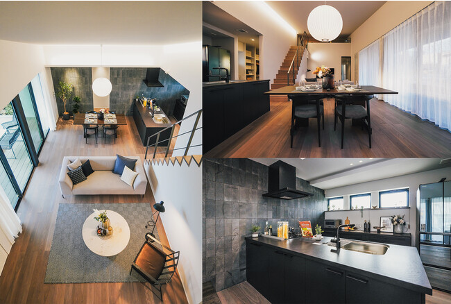 「アールギャラリーとよた平屋展示場」は、平屋ならではの大屋根と水平庇によるダイナミックかつ端正なフォルムとなっており、ライトグレーを基調とした塗壁、石、タイル、木などの素材感を活かした落ち着いたイメージとなっております。内観は、モノトーンを基調としたモダンデザインを用いつつも、素材感のある石・タイルで空間を構成することにより、飽きのこない落ち着いた高級感を保った構成としております。