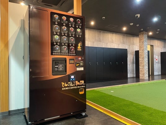 予約なしでいつでも利用できるパターエリア(つくば学園店のみ)の隣に新設したカフェエリアには、コーヒーの自動販売機とカウンターテーブルを設置しました。打席が空くまでの待ち時間や練習後の休憩場所としてご利用いただけます。