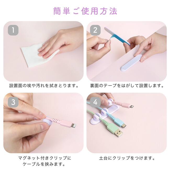 使い方は簡単。接地面の埃や汚れを拭きとり、裏面のテープをはがして設置。マグネット付きクリップにケーブルを挟み、土台にクリップを付けます。