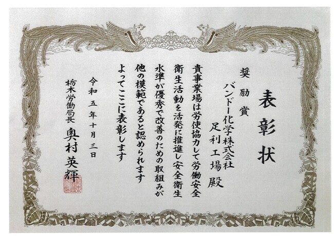 バンドー化学株式会社(本社:兵庫県神戸市)の足利工場(栃木県足利市)は、地域の中で安全衛生に関する水準が良好で他の模範であると認められる事業場として、安全衛生に係る栃木労働局長表彰の奨励賞を受賞しましたので、お知らせいたします。