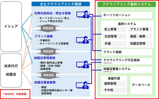 「IOASIS」は、アクワイアリング業務に必要なオーソリゼーションやブランド接続、売上、精算管理等の基幹システムをASP型とオンプレミス型で提供しています。「IOASIS」の活用により、個別のシステム構築に比べ、初期コストを抑え、サービスインまでの期間を短縮し、スムーズなアクワイアリング業務の開始が可能です。2016年の提供開始以降、複数のカード会社および銀行での利用実績があります。