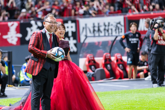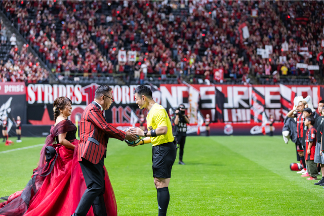 セレモニーでは、おふたりでドレスとタキシードを着用し、試合に使うボールを運んでいただきました。また、試合前の選手たちが集合する写真撮影にもご参加。