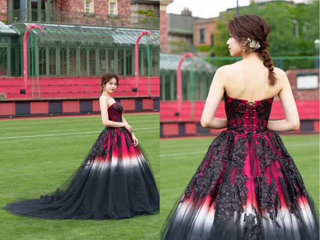 北海道コンサドーレ札幌を象徴する赤黒カラーでまとめたビックシルエットの豪華なドレス。ロングトレーンを赤黒ストライプに仕上げることで、北海道コンサドーレ札幌をよりイメージさせるデザインに仕上げました。