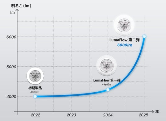 そんな悩みを解決するために、弊社はシーリングファンライト「LumaFlow」の改良を重ね、2023年から2025年の努力の成果として、第四世代のシーリングファンライト「LumaFlowII」を開発しました。