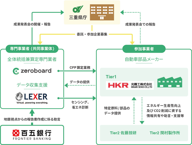 株式会社ゼロボード(東京都港区、代表取締役 渡慶次 道隆、以下「ゼロボード」)と株式会社レクサー・リサーチ(東京都中央区(東京本社)、代表取締役 中村 昌弘、以下「レクサー・リサーチ」)で組成した地域脱炭素経営支援共同事業体(以下「共同事業体」)が、三重県の「令和5年度自動車部品サプライチェーンにおける製品単位CO2排出量算定・削減支援実証事業(以下「本事業」)」を受託し、株式会社百五銀行(三重県津市、頭取 杉浦 雅和、以下「百五銀行」)を加えた3社で協力して事業を実施します。