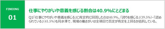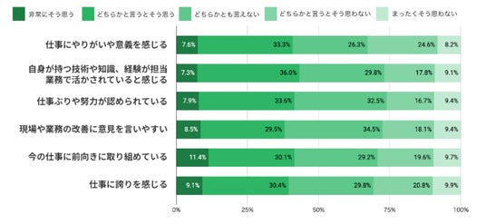 - 「やりがいや意義を感じる」肯定層は約41%に達する一方、「仕事ぶりや努力が認められている」の否定層は約26%存在し、貢献実感と承認実感の間にギャップがある