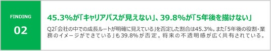 - 「自身の現在のスキルレベルが分かる」は肯定40.4%と相対的に高いが、「会社の中での成長ルート(キャリアパス)が明確に見えている」は否定が45.3%と突出して高い