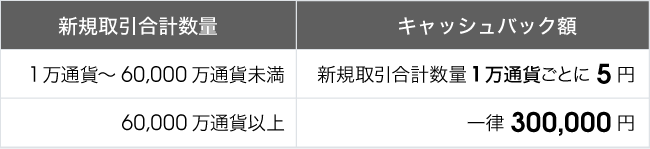 ・新規取引合計数量が5,000万通貨 ⇒ 25,000円キャッシュバック