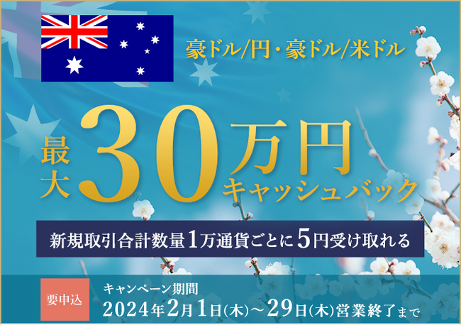 セントラル短資FX株式会社(本社:東京都中央区、代表取締役社長:宮下 俊郎)は、2024年2月1日(木)から29日(木)まで、豪ドル/円と豪ドル/米ドルの新規取引を対象としたキャッシュバックキャンペーンを実施します。