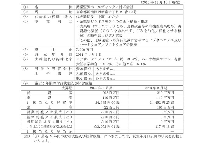 なお、マーチャント・バンカーズ株式会社と循環資源HD社とは、2023年12月11日付で本資本業務提携につきまして、基本合意(「循環資源ホールディングス株式会社との資本・業務提携に関する基本合意のお知らせ」)し、本日付で正式契約を締結したものであります。