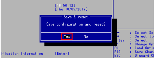 Step3:キーボードの「F10」を押し、「Save configuration and reset?(設定の変更を保存して終了しますか?)」というメッセージが表示されたら、