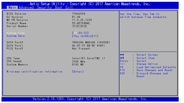 Step1:パソコンの電源を入れ、ロゴが表示されたら「F2」キーを数回押す。すると以下のように、「BIOSセットアップユーティリティ」が起動する
