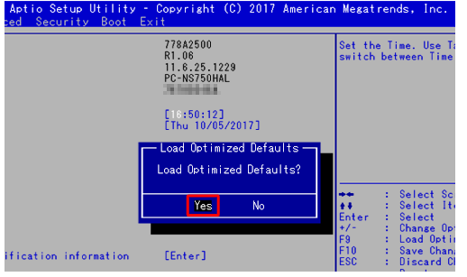 Step2:「F9」キーを押し、「Load Optimized Defaults?(デフォルト値をロードしますか?)」というメッセージが表示されたら、キーボードの方向キー(←、→)を使用して「Yes(はい)」を選択し、「Enter」キーを押す