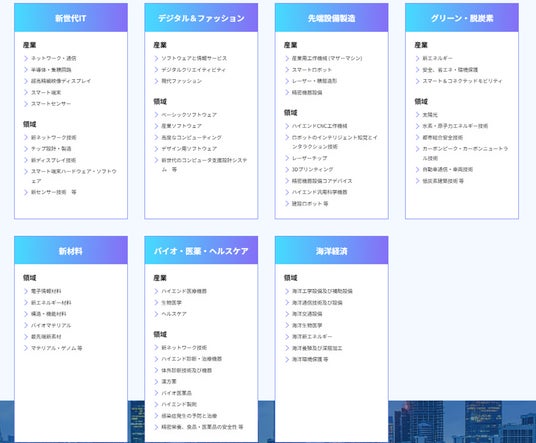 「新世代IT」、「デジタル&ファッション」、「先端設備製造」、「グリーン・脱炭素」、「新材料」、「バイオ・医薬・ヘルスケア」、「海洋経済」の7つの領域から、技術・アイデア・事業を募集します。