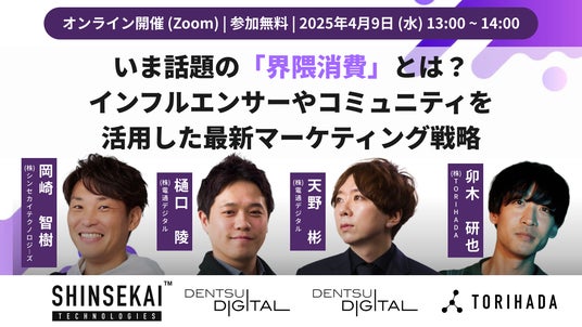 コミュニティ関連サービス群「MURA(ムーラ)」を提供する株式会社SHINSEKAI Technologies(本社:東京都渋谷区、代表取締役:大社 武、以下:当社)は、株式会社電通デジタル(本社:東京都港区、代表取締役社長執行役員:瀧本 恒)と株式会社TORIHADA(本社:東京都渋谷区、代表取締役:若井 映亮)を迎え、無料ウェビナー「いま話題の「界隈消費」とは?インフルエンサーやコミュニティを活用した最新マーケティング戦略」を、2025年4月9日(水)13:00よりオンラインにて開催いたします。