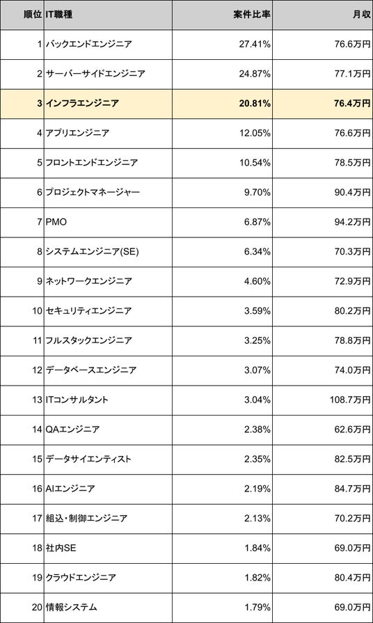インフラエンジニアの案件は市場全体の20.81%を占め、IT職種別の案件数ランキングでは3位に位置しています。平均月額単価は76.4万円で、バックエンドエンジニア(76.6万円)やサーバーサイドエンジニア(77.1万円)と同等の水準です。