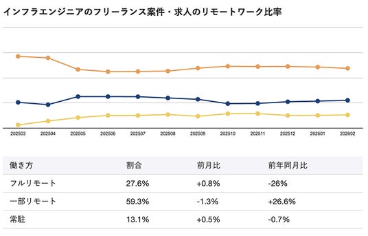 2026年2月時点のインフラエンジニア向けフリーランス案件・求人におけるリモートワーク比率は、フルリモートが27.6%、一部リモートが59.3%、常駐が13.1%となっています。