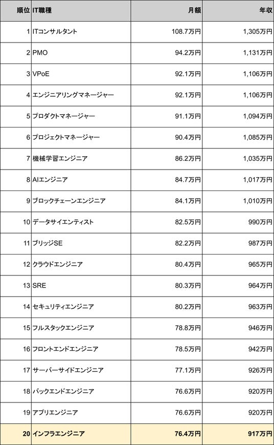 インフラエンジニアの職種別平均年収ランキングは20位(917万円)