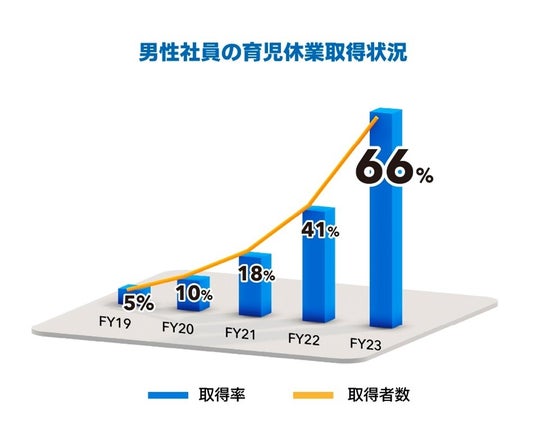 10月19日は、「イクメンの日」です。その由来は、「とう(10)さん」「い(1)く(9)じ」という語呂合わせで、日本記念日協会により認定されています。厚生労働省の「令和5年度雇用均等基本調査」では、全国3,945社の事業所からの回答結果について掲載され、男性の育児休業取得率の平均値は30.1%、取得期間は半数以上(58.1%)*2の取得者が1カ月未満でした。そのような中、オムロンの2023年度の男性育児休業取得率は66%(133名)を記録し、前年度比1.6倍となっていることに加え、平均62.8日の取得日数となっています。