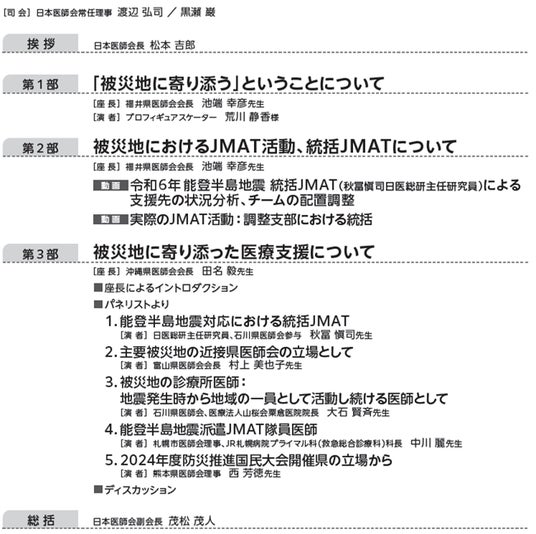 第3回目となる今回は「令和6年能登半島地震 ~被災地に寄り添った医療支援とは?」と題し、日本医師会館とWEBのハイブリッド形式で開催し、3部構成により講演やディスカッションが行われました。