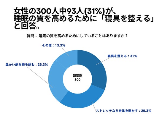 女性の300人を対象とした「睡眠の質を高めるためにしていることはありますか?」というアンケートで93人(31%)が「寝具を整える」という結果になりました。