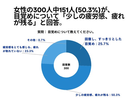 女性の300人を対象とした「目覚めについて教えてください。」というアンケートで151人(50.3%)が「少しの疲労感、疲れが残る」という結果になりました。