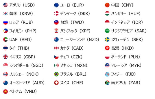 外貨両替サービス:円から外貨、外貨から円への両替サービスを提供。31通貨を取り扱っています。米ドル、ユーロ、英ポンドなどの主要通貨をはじめ、人民元、韓国ウォン、ベトナムドンなどのアジア通貨にも幅広く対応しています。海外旅行や海外出張前に、また帰国後にも便利にご利用いただけます。