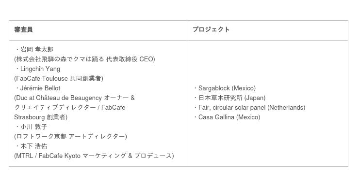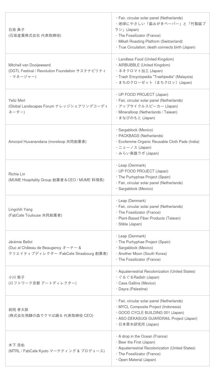 審査は、産業廃棄物中間処理業で減量化・リサイクル化率98%を達成している石坂産業株式会社 代表取締役 石坂典子や、世界で最も持続可能なフェスティバルとして表彰された「DGTL Festival」を開催しているMitchell van Dooijeweerd、アップサイクル生地に新しい命を吹き込むためのワンストップサービスを提供するmoreloopの共同創業者Amorpol Huvanandanaら、国内外の多様な分野のプロフェッショナル5名が参加。さらに世界に拠点を持つFabCafe Globalから5名が加わり、生活、環境、経済に寄与するサーキュラーなアイデア・プロジェクトを選出しました。