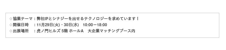 タカラトミーは「玩具からアソビへ」を目指しています。 トミカ・プラレール・リカちゃんなど様々な所有するIPとシナジーを出せる 【XR・メタバース・Web3などのテクノロジー・ソリューション】を所有の方、 【ロボットなどのテクノロジー系トイの日本国内ローンチサポート】を希望の方、 【海外販売・海外需要性調査のソリューション】を所有の方、 タカラトミーと共創いただけるパートナーを募集しています。