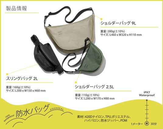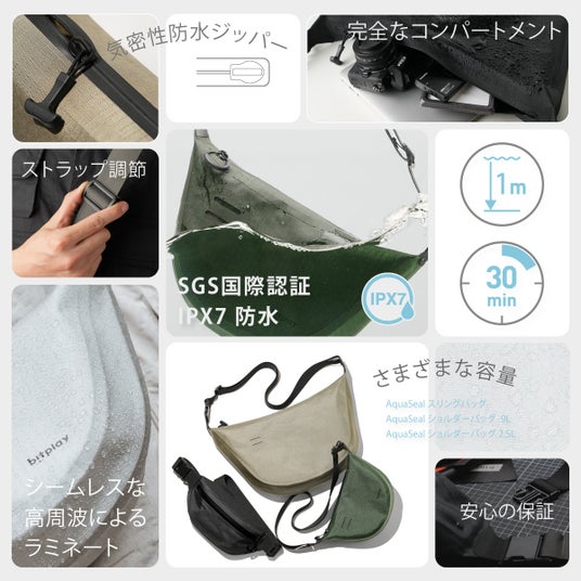 bitplay AquaSeal防水バッグシリーズは、最新の気密防水ジッパーを採用し、バッグに荷物を入れてジッパーを最後までしっかり引けば、国際認証IPX7性能の完全防水となるバッグです。