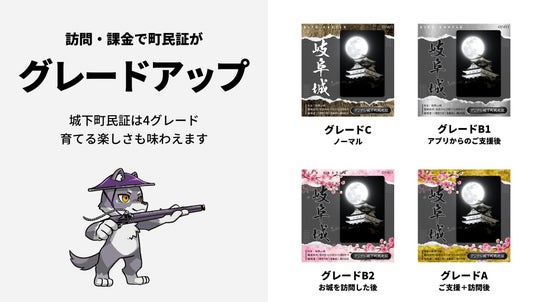 城下町民証には4つのグレードがあり、登城またはプロジェクトへの支援時に城下町民証をグレードアップすることが可能です。城下町民証は複数枚保有することができるため、御城印を集めるようにコレクションできることも、お城ファンにとって大きな魅力となります。