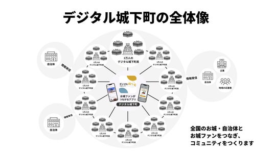「デジタル城下町プロジェクト」は、株式会社バケットが株式会社電算システム等と連携して展開するWeb3型地域創生プロジェクトの総称です。具体的には、全国の城郭を持つ自治体等と連携し、各お城で限定1万枚の「デジタル城下町民証」を発行。お城ファンを中心とする最大1万人に城下町民証を配布し、専用SNSアプリ「デジタル城下町」でオンラインコミュニティを形成します。