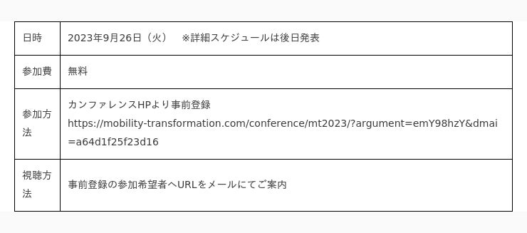 当社は2023年9月26日(火)に開催される「Mobility Transformation 2023」が、脱炭素社会の実現に向けたモビリティの未来、企業に求められる役割と持続可能なイノベーションなど、様々な有識者や企業の方々とともに、日本の未来を考える機会になることを願い、準備を進めております。セッションや登壇者の情報は、随時公式HPで発信していきます。