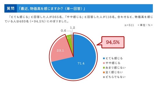 2022年4月以降に引越をした20歳以上の男女511名のうち、最近物価高を「とても感じる」 「やや感じる」と回答した人は483人(94.5%)でした。中でも「食」に関する物価高感が強く、 特売を利用するなど「食」に関する消費で物価高対策を行っている様子もうかがえます。