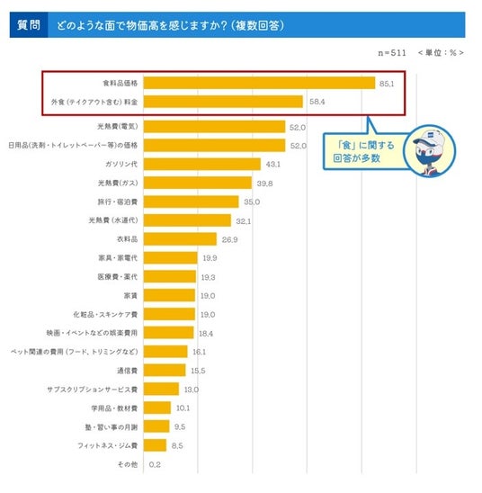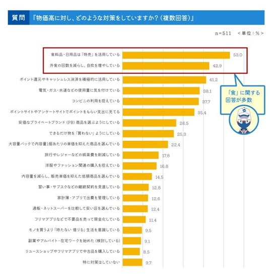 「どのような面で物価高を感じるのか」「どのような対策をしているか」の問いに対して回答が多かったのは「食」に対する選択肢でした。中でも、食料品価格に対して物価高を感じる人は85.1%と高い数値を示しました。また、物価高の対策も「食」に関する回答が高い数値を示しました。
