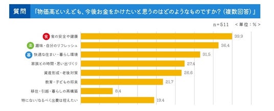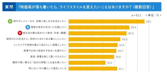 最後に、調査対象の511名に、物価高の今後について2つの質問をしたところ、直接的に「食」「暮らし」 「楽しみ」に関わる項目を挙げた人が多いことが分かります。