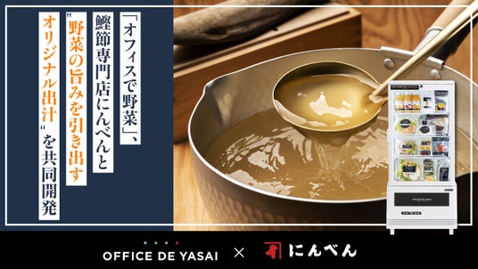 食の福利厚生サービス“設置型健康社食(R)“「OFFICE DE YASAI(オフィスで野菜)」(以下、「オフィスで野菜」)を運営する株式会社KOMPEITO(東京都品川区、代表取締役CEO渡邉瞬)は、元禄12年創業の株式会社にんべん(東京都中央区、代表取締役社長 高津伊兵衛)と共同で“野菜の旨みを引き出すオリジナル出汁“を企画開発しました。
