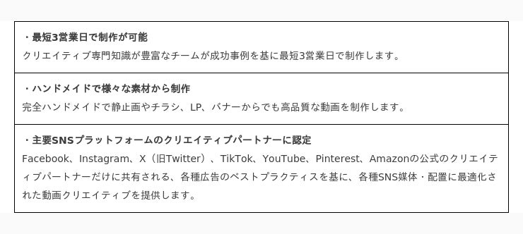 各SNSごとのベストプラクティスやデザイナーのノウハウを活かした動画制作で、ブリーフシートを記入し、既存の静止画を提出するだけで、クオリティの高い動画が納品されます。