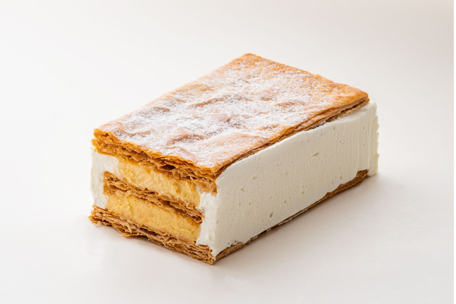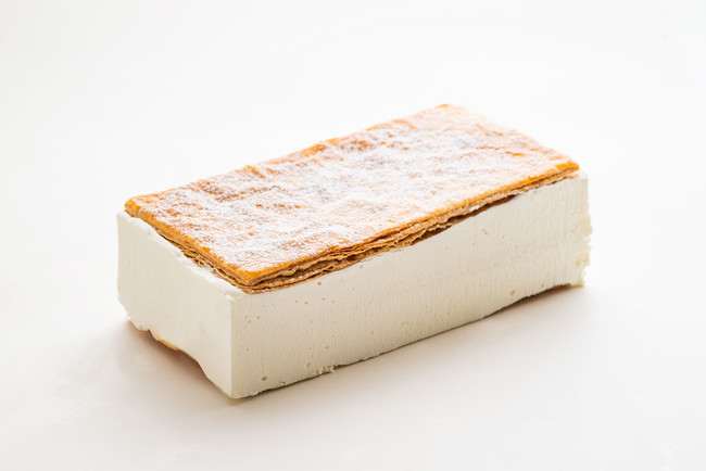 2 種類のクリーム(チョコレートクリーム、カスタードクリーム)と生地の比率は、7(クリーム):3(パイ生地)。一般的なミルフィーユに比べクリームの比率を多めにすることによって、アイスケーキのような食感になり、半解凍状態と完全解凍で違ったおいしさを楽しめる「ミルフィーユ」です。