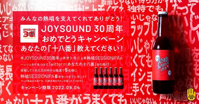 またこの度、「熱唱SESSION IPA」の醸造記念、並びに「JOYSOUND」の30周年を記念してキャンペーンを開催中です。カラオケの「十八番」を、キャンペーンツイートのハッシュタグをつけて引用RTしてくださった方から抽選で5名に「熱唱SESSION IPA」6本セットが当たるキャンペーンとなっています。皆様からのご応募をお待ちしております。