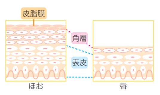 唇の皮膚は頬などと違い、角層が薄く、皮脂腺や汗腺がないため保湿機能やバリア機能が低く、顔の中でも乾燥しやすいため敏感になりやすい部位と言われています。またメラニンの産生がないため紫外線に対する防御システムがなく、飲食や唇同士のすり合わせなどで日常的に摩擦を繰り返しています。このため、乾燥から守り、うるおいを与えるケアと配慮が必要とされています。