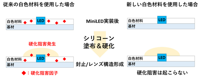 一般的なMini LEDバックライトユニット製造では、プリント基板表面に感光性白色絶縁材料層を形成、露光、現像によりパターニング後にプリント基板を完成させます。その後、プリント基板にMini LEDを実装し、その上へ透明シリコーン樹脂を用いて透明封止加工を施します。このシリコーン樹脂工程はLEDの信頼性を確保し、また同時にレンズ構造等を形成して適切な光学特性を実現するために重要ですが、従来の感光性白色インキを使用した場合、シリコーン樹脂の硬化阻害が発生しやすいことが課題となっていました。
