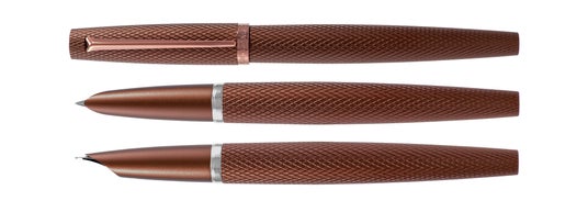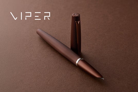 VIPERは「ELOX(エロックス)」以来3年ぶりの新シリーズとして2024年11月に登場、販売各国で初回ロット即完売と好評の中、新色を追加。既存のブルー・ブラックの仕様は継承しつつ、その芳醇なメタリックブラウンの光彩は、全く異なるエレガントさを付与します。爬虫類のウロコをもった外皮を思わせる全面にギロシェパターンの彫刻が施されたアルミニウム製のボディも特徴的で、実用的な価格設定と相まって初めての万年筆から愛好家の収集対象まで幅広いニーズを捉えます。